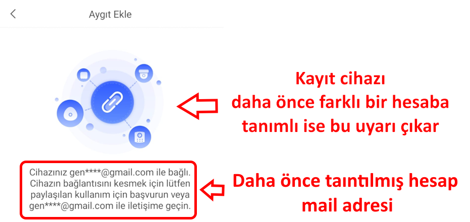 DVR yada NVR kayıt cihazı tanımlı oldğu hesaptan ayrılmadan farklı bir hesaba tanımlanamaz bu nedenle izleme yapılamaz.