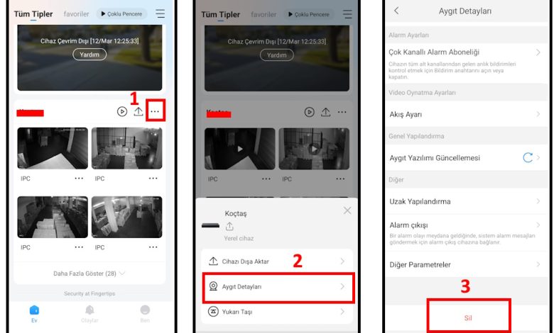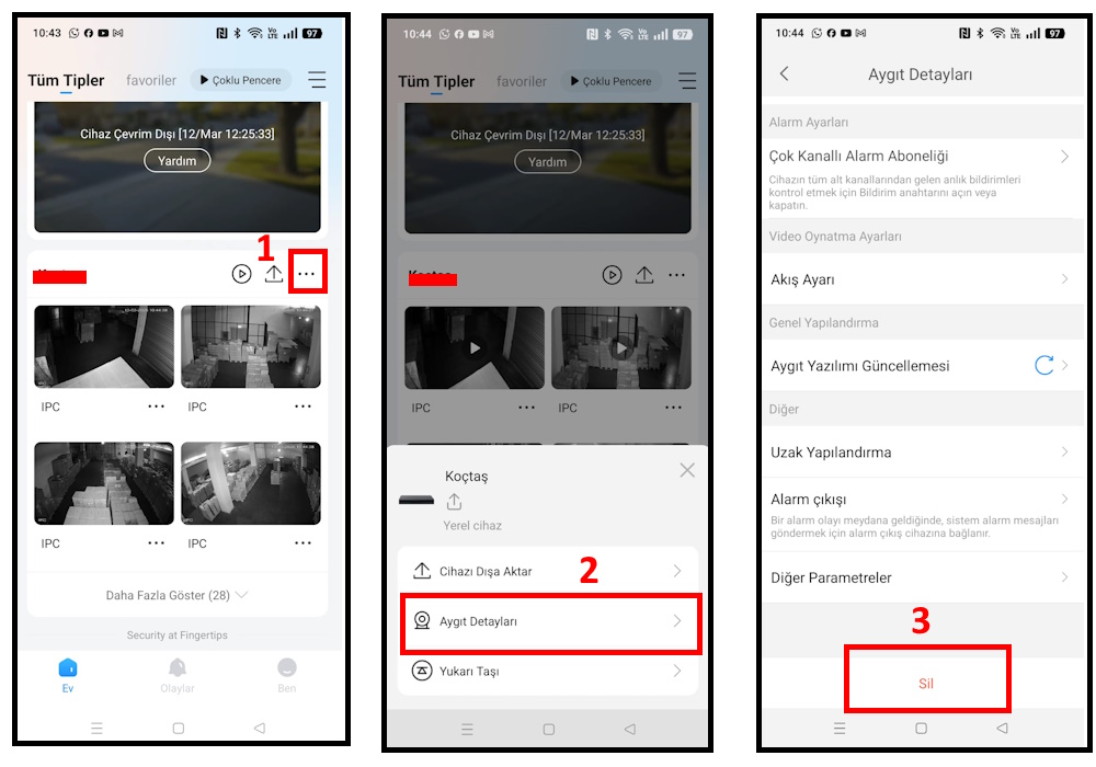 Aygıt isminin sağ tarafındaki 3 noktaya basılır. Açılan menüde Agıt Detaylarına girilir. Aygıt detaylarında en altta Sil seçeneğine basılarak DVR kayıt cihazı tanımlı olduğu DMSS hesabından silinir. Bu işlem yapıldıktan sonra Yeni DMSS hesabına kayıt cihazı tanımlanarak izleme yapılabilir.