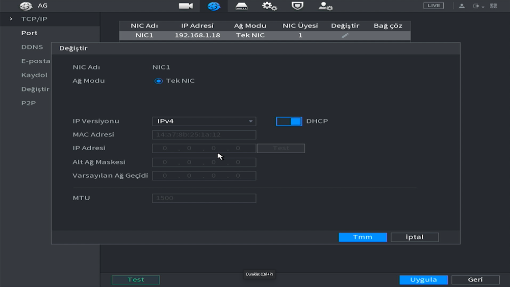 Analog HD Kamera kayıt cihazında DHCP özelliği açık olur ise farklı ip bloğundaki modem takıldığında kamera kayıt cihazı doğru ip adresini otomatik olarak alır ve dvr P2P Servera bağlanarak güvenlik kamera görüntülerinin internet üzerinden izlenmesi aktif olur. Kimi kayıt cihazında otomatik ip kinide DHCP yazar.